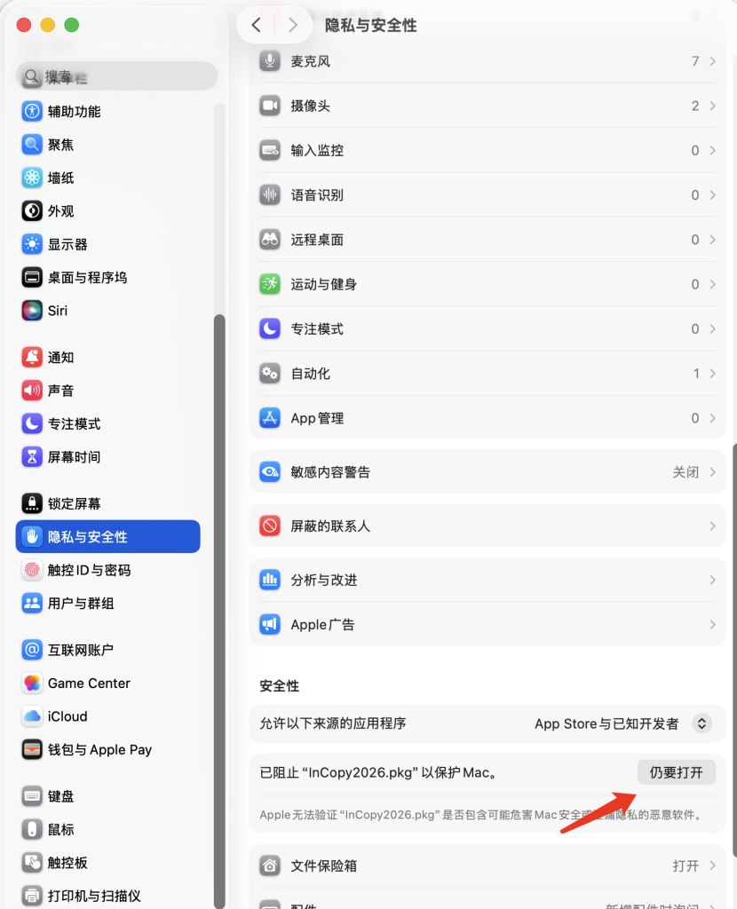 2,如果弹出这样,就是电脑有权限,去系统设置上点隐私安全点击要打开(MAc系统权限问题和软件无关)。